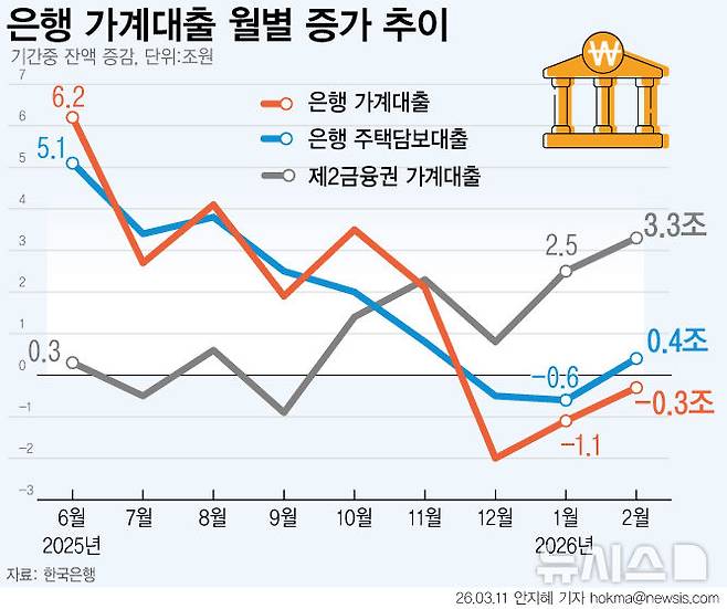 [그래픽] 은행 가계대출 3개월 연속 감소…주담대는 4000억 증가