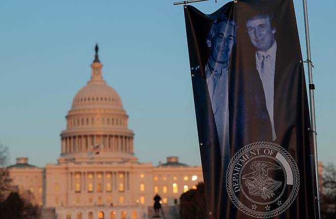 | ▲ 지난 10일 워싱턴 DC 내셔널 몰에서 도널드 트럼프 미국 대통령과 고(故) 성범죄자 제프리 엡스타인을 풍자한 '타이타닉' 테마 조각상 근처에 현수막이 걸려 있다. |