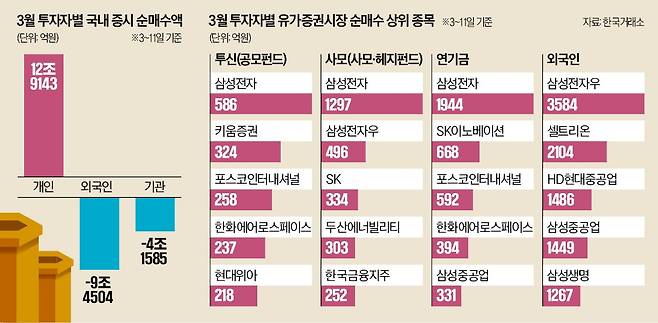 연기금 순매수 1위 종목도 삼성전자였다. 1944억원어치를 순매수했다. 투신과 마찬가지로 포스코인터내셔널(592억원), 한화에어로스페이스(394억원)도 매집했고, 유가 상승 위험을 상쇄할 수 있는 SK이노베이션(668억원)도 담았다. 한 자산운용사 대표는 “삼성전자의 경우 실적 전망치가 지속적으로 상향되고 있는 데다 8700만 주에 달하는 자사주 소각 방침까지 내놨다”며 “전쟁이 끝나면 가장 먼저 주가를 회복할 주도주라고 판단한다”고 말했다.