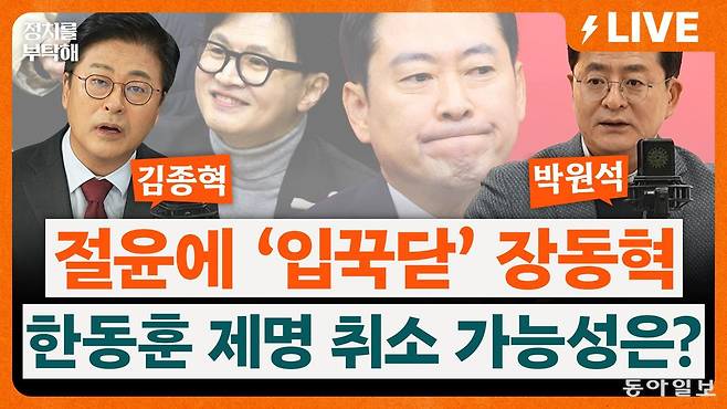 ▶박원석: 되나 보다 이런 게 있었는데 아무것도 아니네. 이게 이제 대체적인 평가예요. 그마저도 중앙일보 보도를 통해서 이거 뭐 선거 앞두고서 궁지에 몰리니까는 일종의 약속 대련 쇼하는 거 아니냐 이런 시각까지 지금 곁들여져 있어서 위기는 계속되는 거고 반전은 없다. 그러면 장동혁 대표가 사실 결자해지하려면 간단합니다. 자기 스스로 자기 목을 치면 돼요. 그러면 모든 문제가 해결돼요.