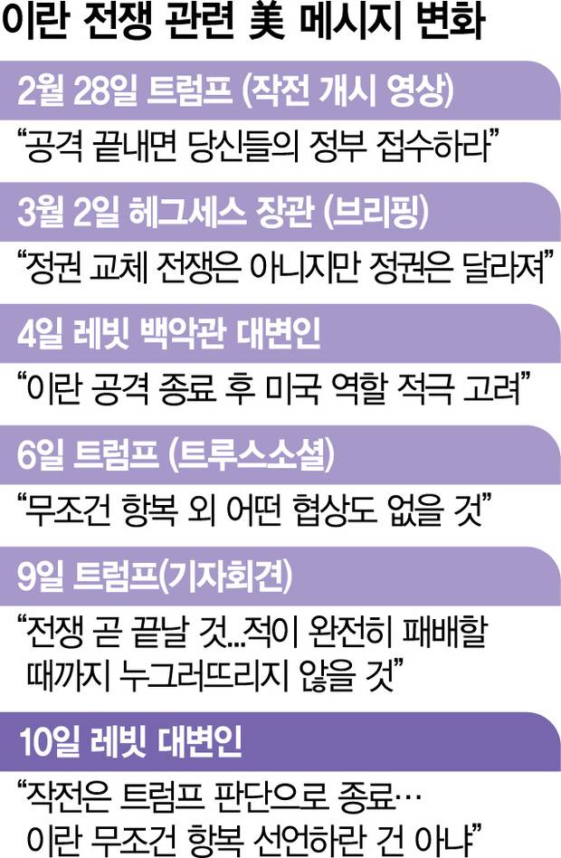 이란과 전쟁을 시작할 때는 '정권 교체'를 목표로 내세웠던 미국이 "이란이 무조건 항복을 선언하라는 것은 아니다"라고 후퇴하면서 오락가락하는 말 속에서도 출구를 찾고 있다는 분석이 나오고 있다.