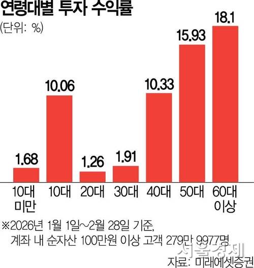 11일 서울경제신문이 올해 1월 1일부터 2월 28일까지 미래에셋증권 고객 279만 9977명(계좌 내 순자산 100만 원 이상 고객)의 연령대별 수익률을 분석한 결과 60대 이상 투자자가 18.1%로 가장 높았다. 50대가 15.93%이며 40대(10.33%), 10대(10.06%)가 뒤를 이었다. 반면 20대와 30대 투자자의 수익률은 각각 1.26%, 1.91%에 그쳐 저조했다. 이 조사에는 증시에 직격탄이 된 중동 사태 여파는 반영되지 않았다.