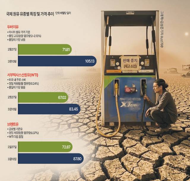 한국석유공사 유가정보시스템 오피넷에 따르면 미국·이란 사태 발발 직전인 지난달 27일 기준으로 두바이유(배럴당 71.24달러) 가격은 브렌트유(72.48달러)보다 저렴했고, WTI(67.02달러)보다는 조금 비쌌다.