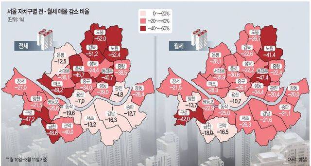 이에 비해 강남 3구의 전세 매물 감소 폭은 서울 평균보다 작았다.