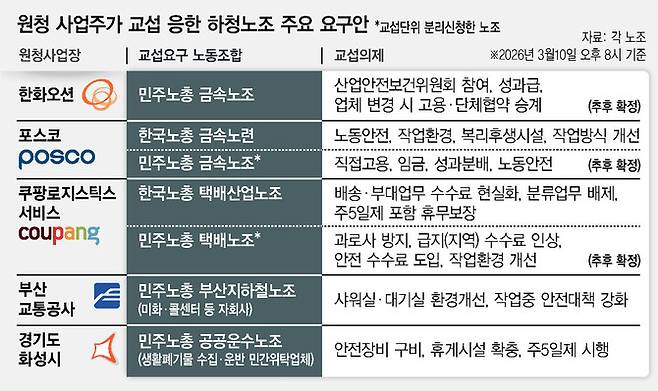 이수출 위원장이 일하는 포스코를 포함해 한화오션, 쿠팡로지스틱스서비스(CLS·씨엘에스), 경기 화성시, 부산교통공사, 대방건설, 일신건영 등 7곳이 하청노조와 교섭을 하기 위해 법적 절차에 따라 교섭요구 사실을 공고했다. 이들 기업·기관과 해당 노조의 말을 종합하면, 주로 산업안전·작업환경 개선이 교섭 의제로 올라왔다.