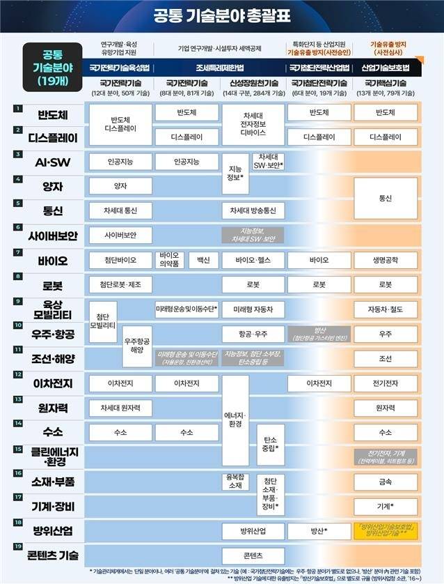 19개 분야는 ▲반도체 ▲디스플레이 ▲인공지능(AI)/소프트웨어(SW) ▲양자 ▲통신 ▲사이버보안 ▲바이오 ▲로봇 ▲육상 모빌리티 ▲우주·항공 ▲조선·해양 ▲이차전지 ▲원자력 ▲수소 ▲클린에너지·환경 ▲소재·부품 ▲기계·장비 ▲방위산업 ▲콘텐츠 기술 등이다.