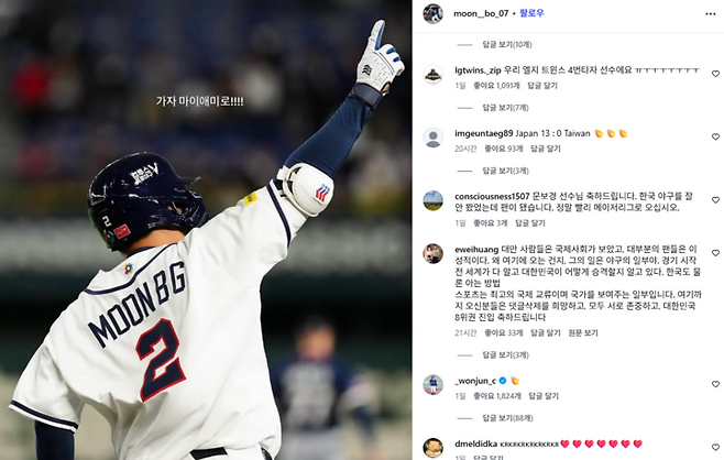 이에 8강행을 놓친 대만의 일부 팬들이 문보경의 개인 소셜미디어(SNS)에 찾아와 눈꼴사나운 욕설을 남겼다.