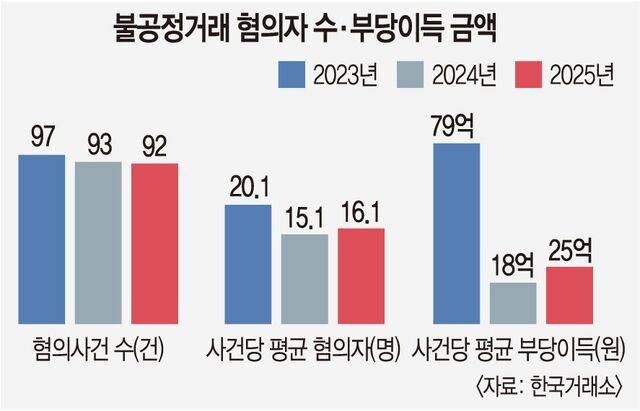 한국거래소 시장감시위원회가 지난해 주식시장 불공정거래 혐의로 금융위원회에 통보한 사건은 98건으로 집계됐다. 이중 미공개정보를 이용한 사건이 58건(59.2%)으로 가장 많았고, 부정거래(18건·18.4%)와 시세조종(16건·16.3%)이 뒤를 이었다. 코스닥시장(66건)에서 가장 많이 확인됐고 이어 코스피(28건), 코넥스(2건) 순이었다.