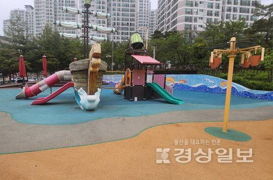 바닥은 바다색으로 단장하여 더욱 바다 느낌이 난다. 무채색의 해적선과 큰 통이 달린 알록달록한 미끄럼틀이 서로 쌍을 이루고 있어 단짝 친구처럼 보인다. 그 옆에도 작은 물통이 넷 달린 구조물이 서 있다. 그 아래에서 해맑게 웃을 아이들의 모습이 또다시 그려진다.