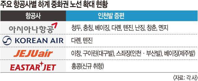 11일 업계에 따르면 아시아나항공은 하계 기간이 시작되는 오는 29일부터 중국 18개 노선을 주 161회로 늘려 운항한다. 동계 대비 20% 확대됐다. 동계에는 운영하지 않았던 인천∼청두·충칭 노선을 매일 가동하고, 인천발 베이징 노선이 주 17회에서 20회로 늘어난다. 인천∼다롄 노선은 주 10회 운항하고, 인천∼톈진·난징 노선도 주 7회씩 증편된다. 5월부터는 인천∼창춘·옌지 노선도 각각 주 9회와 8회로 확대 조정된다. 대한항공도 5월부터 인천∼톈진·다롄 노선을 하루 두 차례로 늘릴 계획이다.