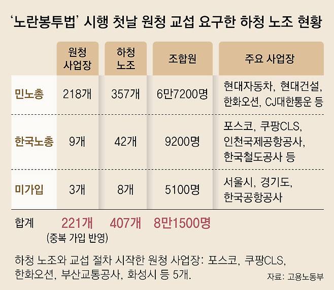 상급단체별로 보면 전국민주노동조합총연맹(민노총) 소속 노조가 88%로 압도적으로 많았다. 민노총 산하의 하청 노조 357곳, 조합원 6만7200명이 대기업과 건설사, 택배사, 대학 등 원청 218곳을 상대로 교섭을 요구했다. 한국노총은 하청 노조 42곳, 조합원 9200명이 원청 9곳에 교섭을 신청했다. 노동부 관계자는 “한국노총은 아직 본격적으로 교섭에 나서지 않았고 민노총 역시 추가 요구가 이어질 것으로 보인다”며 “교섭을 요구하는 노조는 더 늘어날 것”이라고 했다.