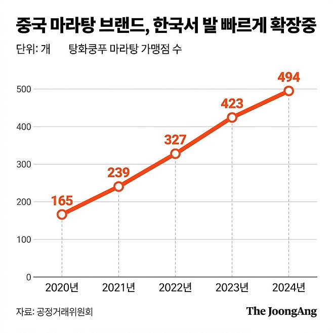 당장 식음료 브랜드 진출이 부쩍 늘었다. 마라 요리 전문점인 ‘탕화쿵푸 마라탕’은 국내에만 494곳의 매장을 운영하고 있다. 중국 밀크티 프차이즈인 ‘차백도’ ‘미쉐’ ‘헤이티’는 이미 국내에 각각 6~24개의 매장을 냈고, ‘차지(CHAGEE)’도 올 상반기 서울 강남·용산·신촌 등 주요 상권에 매장을 열 예정이다. 차지 관계자는 “카페 문화가 발달한 한국에서 최근 차에 대한 관심이 커지고 있어 성장 가능성이 크다고 본다”며 “한국 소비자가 품질에 깐깐한 만큼 프리미엄 차 경험을 제공해 공략할 것”이라고 말했다.