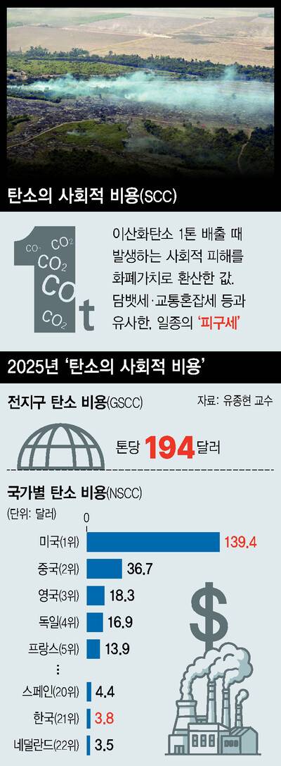 유 교수가 지난해 국제학술지 ‘기후변화 경제학’에 게재한 논문을 통해 산출한 전 지구 탄소 비용은 톤당 194달러로, 2023년 미국 환경보호청이 추산한 190달러와 거의 같다. 유 교수는 전세계 200개 나라의 ‘국가별 탄소 비용’(NSCC)도 산출했는데 1위는 미국으로 139달러, 2위 중국 37달러였다. 두 나라를 합치면 전세계 총액의 약 40%다. 이어 영국(18달러), 독일(17달러), 프랑스(14달러) 순이다. 유 교수는 국가별 탄소 비용에 영향을 미치는 요소로 “인구와 1인당 국내총생산(GDP) 등의 경제 규모”를 꼽았다. “기후재난이 닥쳤을 때 가진 게 많은 나라가 잃을 것도 많다는 의미”라는 것이다.