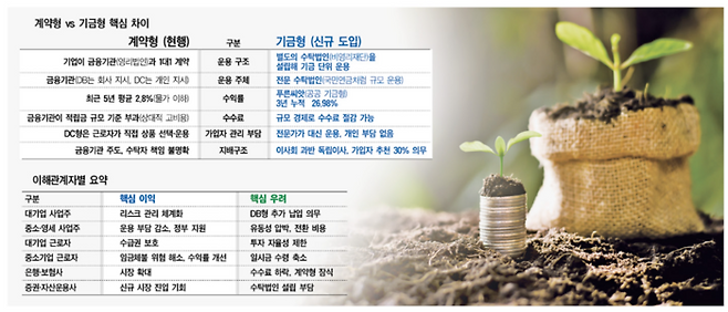 금융권에는 기회와 위기가 동시에 찾아온다. 퇴직연금 미도입 사업장이 의무 가입하면 430조 원 규모의 신규 적립금이 유입되는 반면, 기금형 도입으로 수수료율은 하락 압력을 받는다. 계약형 시장을 장악해온 은행ㆍ보험사엔 시장 잠식 리스크가, 증권ㆍ자산운용사엔 신규 진입 기회가 각각 열리는 구도다.