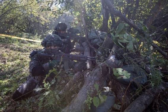 [육군이 지난 22일부터 26일까지 강원 인제군 육군 과학화전투훈련단에서 제3회 국제 과학화전투 경연대회를 실시했다고 27일 밝혔다. 사진은 산악지역 교장에서 상대팀을 피해 은엄폐하고 있는 한국군 장병들의 모습. (사진=연합뉴스)]