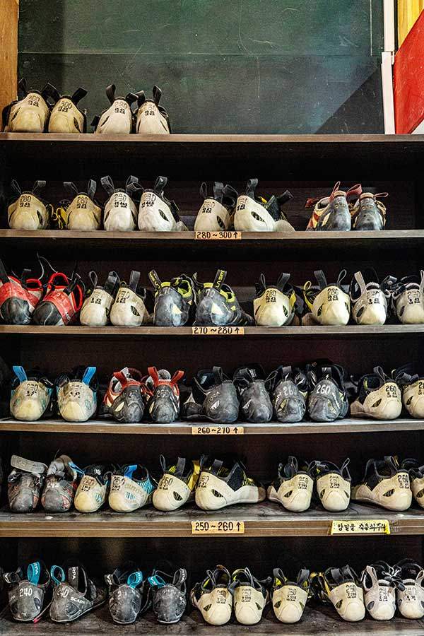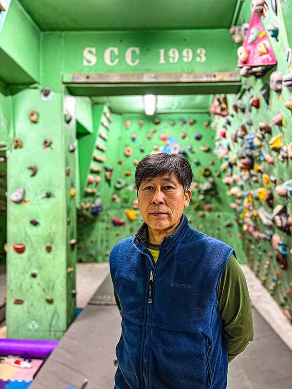 '실내인공암벽', 녹슨 간판이 달린 건물 계단을 내려가면 민트색 벽으로 둘러싸인 옹골찬 암장이 나온다. 'since 1993.' 서울 1세대 암장이라 해도 무색하지 않을 정도로 깊은 역사를 안고 있는 암장이다. 한국 암벽등반 문화가 막 형성되어 왕성해지던 시기 만들어진 서울스포츠클라이밍센터는 수많은 클라이머들의 아지트가 되었다. 그들은 50평 남짓의 천장 낮은 암장에서 숙식하며 훈련했다. 운동하러 오는 길에 석유를 사와 곤로에 불을 붙였고, 동굴 같은 벽 아래서 라면을 끓여먹었다. 암장에 설치되어 있는 철봉과 나무판으로 직접 만든 트레이닝 보드의 벗겨진 페인트칠은 세월의 흔적을 여실히 보여 준다.