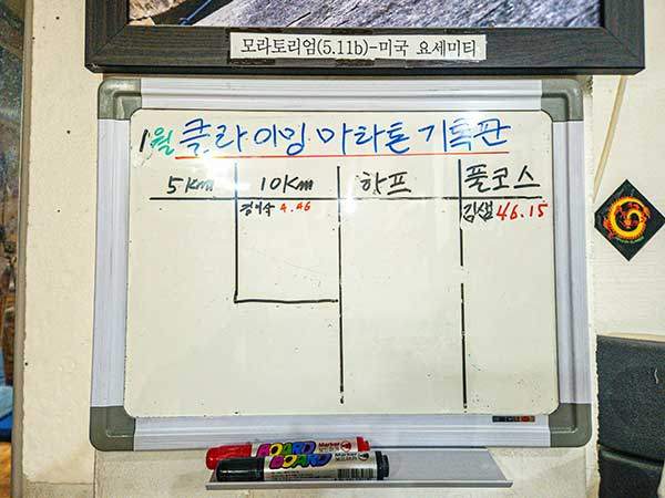 암장의 루트들은 난이도 별로 각각 50개의 홀드를 이어 만들어진다. 각기 다른 난이도의 루트를 연결해 완주하는 것이 김 센터장이 만든 클라이밍 마라톤이다. 암장 한 켠에는 월별 마라톤 기록판이 있다. 홀드를 총 300개 잡아야 하는 풀코스 마라톤 참가율은 매우 낮은 편이다.
