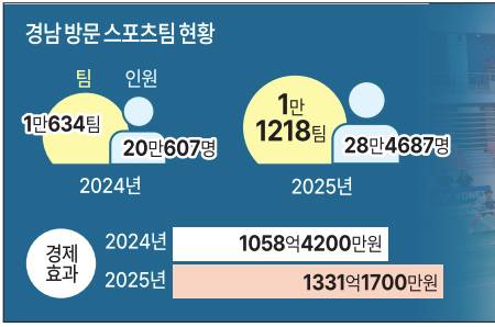 지난해 고성군에 가장 많은 스포츠팀이 찾았으며 양산시와 창원시가 뒤를 이었다. 양산시는 2024년 852개 팀에서 2025년 2372개 팀으로 크게 늘어나며 전년 대비 가장 높은 증가세를 보였고, 밀양시와 통영시가 뒤를 이었다.