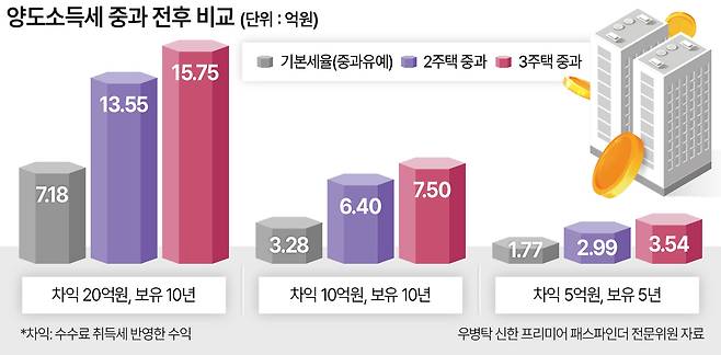 실제 6월 이전에 팔지 않으면, 다주택자의 세부담은 큰 폭으로 확대된다. 우병탁 신한 프리미어 패스파인더 전문위원이 시뮬레이션한 결과, 10년 이상 보유한 아파트를 10억원 차익을 내면서 매도할 경우 양도소득세가 기본세율로는 3억2891만원이지만, 2주택이면 6억4076만원, 3주택은 7억5049만원까지 오른다. 양도소득세에 10%가 추가로 부과되는 지방소득세까지 고려하면 3주택자의 경우 약 80%의 양도차익을 세금으로 내야 한다.