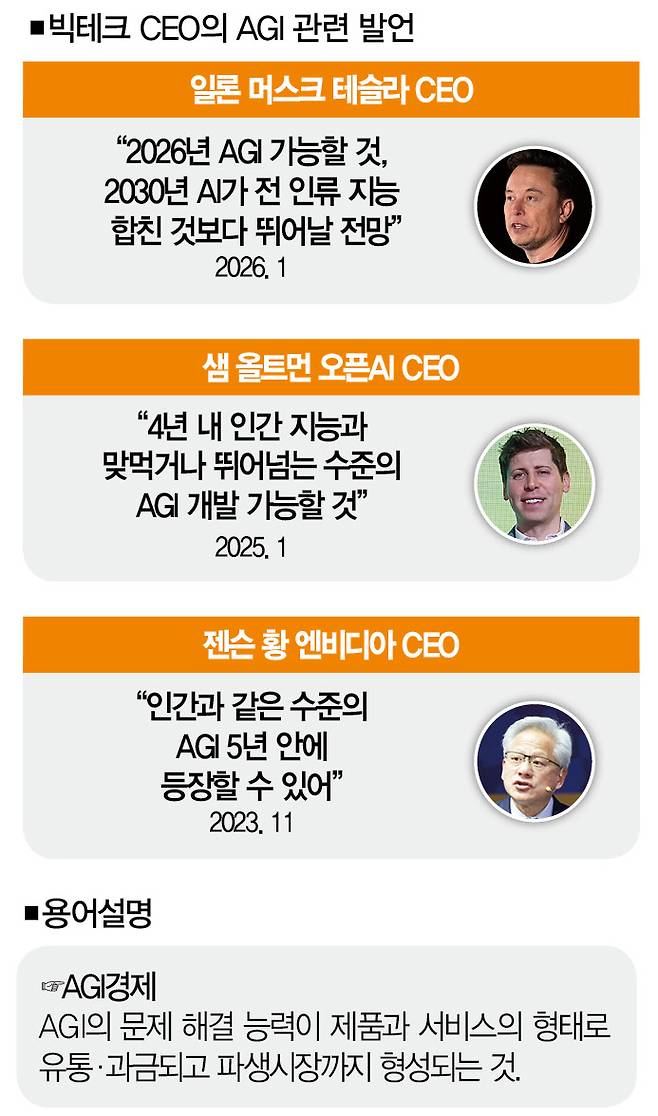 일론 머스크 테슬라 CEO는 지난 1월 미국 기업가 피터 디아만디스의 팟캐스트에 출연해 "올해 AGI가 가능할 것"이라면서 "2030년까지 AI가 전 인류의 지능을 합친 것보다 뛰어날 것"이라고 밝혔다.