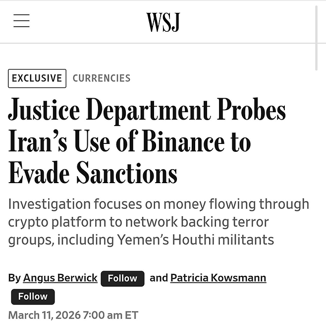 월스트리트저널(WSJ)은 11일(현지시간) 이란이 지원하는 테러 단체 네트워크에 공급된 10억 달러(약 1조5천억원) 이상의 자금 흐름에 관한 바이낸스의 내부 조사가 중단된 사실이 내부 문서와 관계자 진술로 드러났다고 보도했다.