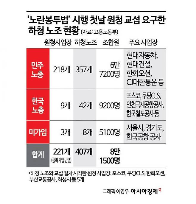 노란봉투법 시행 첫날 하청 노조 407곳이 교섭을 요구했고, 한화오션, 포스코 등이 직접 교섭 절차에 착수했다. 한화오션은 오는 17일까지 추가 교섭 요구 접수를 받는다는 공지를 내고, 개별 교섭 여부나 창구 단일화 방식 등을 논의할 계획이다. 다만 하청지회별로 원청의 사용자성 판단을 두고는 차이가 있다.