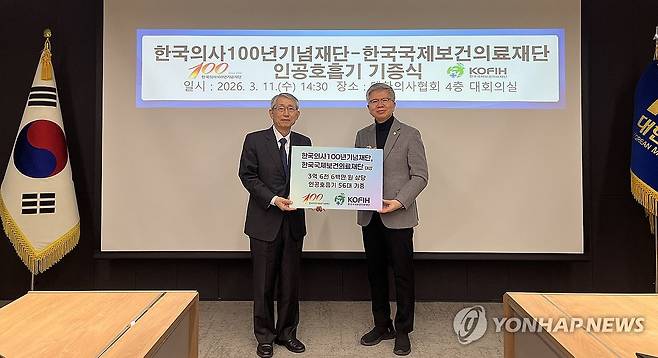 (서울=연합뉴스) 김택우 한국의사100년기념재단 이사장과 하일수 한국국제보건의료재단 이사장이 지난 11일 대한의사협회에서 열린 한국의사100기념재단-한국국제보건의료재단 인공호흡기 기증식에서 기념 촬영하고 있다. 2026.3.12 [대한의사협회 제공. 재판매 및 DB 금지]
