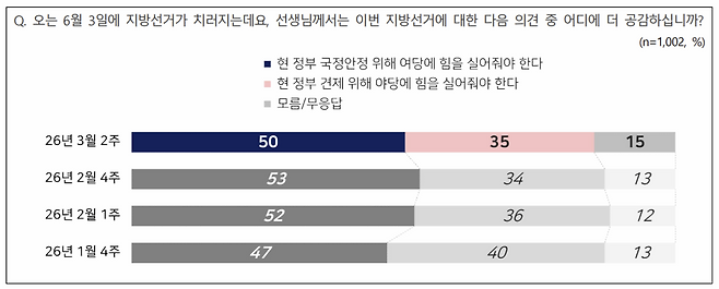 오는 6월3일 실시되는 지방선거의 성격과 관련해서는 ‘현 정부의 국정 안정을 위해 여당에 힘 실어줘야 한다’는 응답이 50%, ‘견제를 위해 야당에 힘을 실어줘야 한다’가 35%로 집계됐다. 지난 조사 대비 ‘국정 안정 위한 여당 지지’는 3%포인트 떨어진 반면, ‘견제 위한 야당 지지’는 1%포인트 올랐다.