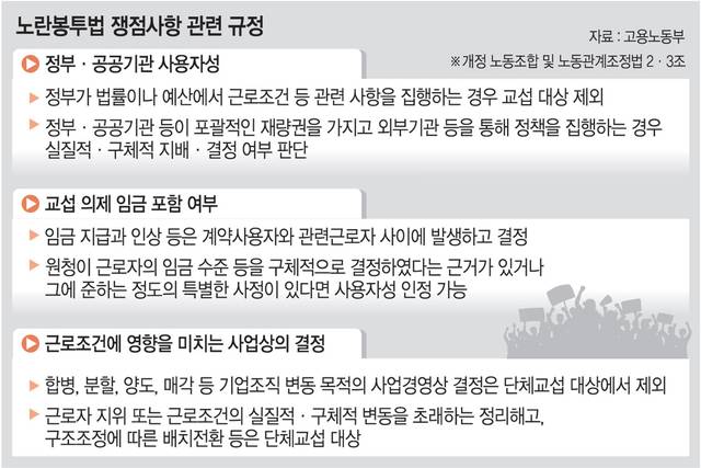 정부는 공공 부문부터 모범을 보인다고 했지만, 노조의 요구를 대폭 수용할 경우 대규모 교섭 요구가 들어올 가능성이 있어 고심하고 있는 것으로 전해졌다. 익명을 요구한 한 노동법 전문가는 “법을 만들 때부터 모호하다는 지적이 많았고, 해석 지침에도 여러 가지 상황을 가정해 포괄적인 지침밖에 담을 수 없었다”며 “임금 교섭의제 포함 여부 등 정부가 판단하기 어려운 부분이 많을 것”이라고 말했다.