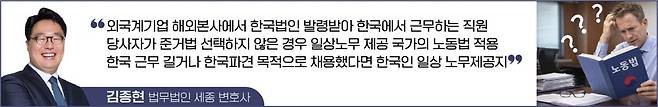 #본사 파견 직원과 한국 노동법의 적용 문제 마지막으로, 한국 노동법의 적용 대상인지 여부에 대해 오해를 하는 경우도 많이 보았다. 외국계 기업은 해외 본사에서 한국법인으로 발령(secondment)을 받아와서 한국에서 근무하는 경우도 많다. 보통 이런 본사 인력은 한국 노동법 적용을 주장하면서 구제 신청이나 소송을 제기하는 경우가 드물기 때문에 최근까지는 이런 본사 인력에게 한국 노동법 적용을 해야 하는지 여부에 관한 고민 자체가 희귀한 것이었다. 그러나 최근 한국 노동법의 보호범위가 생각보다 넓다는 점이 많이 알려지면서 이러한 문제제기가 이루어지는 경우가 더 이상 드물지 않게 되었다.