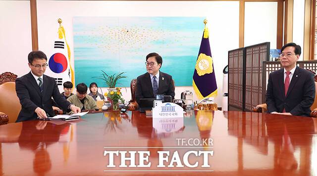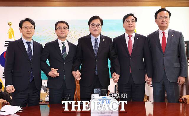 [더팩트ㅣ국회=박헌우 기자] 우원식 국회의장과 한병도 더불어민주당 원내대표, 송언석 국민흼힘 원내대표가 12일 오전 서울 여의도 국회에서 열린 여야 원내대표 회동에 참석해 기념촬영을 하고 있다.