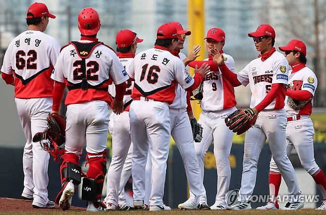 (광주=연합뉴스) 조남수 기자 = 12일 광주기아챔피언스필드에서 열린 프로야구 SSG 랜더스와 KIA 타이거즈의 시범경기. KIA 선수들이 9-4로 승리하고 하이파이브를 나누고 있다. 2026.3.12