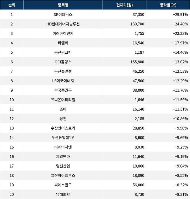 6위 OCI홀딩스(010060)는 종가 165,800원으로 13.02% 상승 마감했다. 7위 두산퓨얼셀(336260)은 종가 46,250원으로 12.53% 상승 마감했다. 8위 LS에코에너지(229640)는 종가 47,500원으로 12.29% 상승 마감했다. 9위 부국증권우(001275)는 종가 38,000원으로 11.76% 상승 마감했다. 10위 유니온머티리얼(047400)은 종가 1,646원으로 11.59% 상승 마감했다.