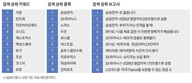 리포트 검색 순위에서도 삼성전자와 SK하이닉스에 대한 관심이 압도적이었다. 같은 기간 검색 상위 리포트 10건 중 6건은 두 회사에 대한 보고서였다. 특히 삼성전자에 대한 리포트가 1~3위를 휩쓸었다.