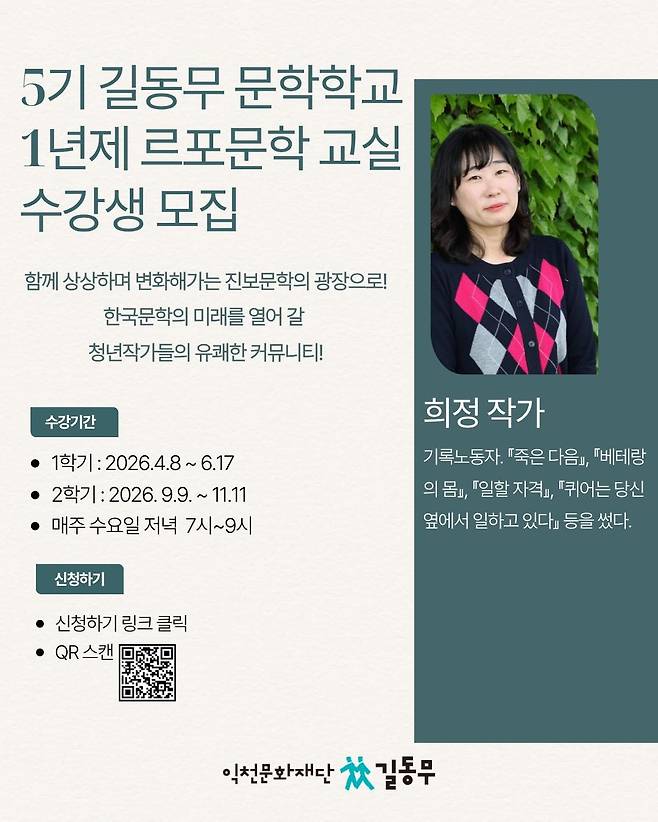 덧붙이는 글 | 글쓴이. 희정. 기록노동자. '죽은 다음', '일할 자격', '뒷자리', '노동자 쓰러지다' 등을 썼다. 길동무 문학학교에 관한 자세한 내용은 '익천문화재단 길동무' 홈페이지를 참고하길 바랍니다. https://gildongmu21.com/