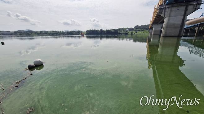 | ▲ 2025년 8월 28일 남지철교 쪽 낙동강 녹조. |