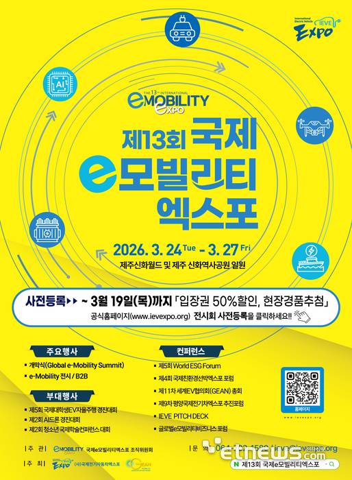오는 24일부터 27일까지 나흘간 제주신화월드에서 '제13회 국제 e모빌리티 엑스포(IEVE 2026)'가 성대하게 개최된다.