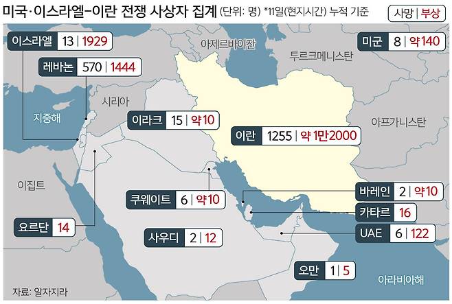 이란의 보복 공격으로 이스라엘에서는 13명이, 미군은 8명이 각각 숨졌다. 이라크(15명), UAE(6명), 사우디아라비아, 바레인(각 2명), 오만(1명) 등은 이란의 보복 공습에 사망자가 발생했다.