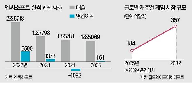 새 전략의 배경엔 단일 IP 중심의 사업 구조에 대한 엔씨의 문제의식이 있다. 지난해 모바일 게임 매출(7944억원)의 절반 이상(53%)이 리니지M·M2·W 등에서 발생했다. 이날 서울고등법원은 엔씨가 카카오게임즈와 엑스엘게임즈를 상대로 리니지2M을 표절했다며 제기한 저작권 침해 소송 항소심에서 1심에 이어 카카오게임즈 손을 들어줬다. 글로벌 시장에서 모바일 게임 비중이 커지고 장르 다양화가 진행되는 상황에서 특정 IP와 장르에 집중된 구조로는 안정적인 성장을 이어가기 어렵다는 판단이 나올 수 밖에 없다. 리니지에만 목맨 사이 매출은 2022년 2조5718억원에서 지난해 1조5069억원으로 쪼그라들었고, 같은 기간 영업이익은 5590억원에서 161억원으로 급감했다.