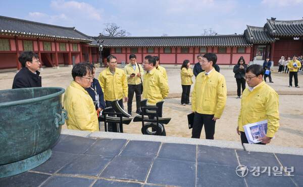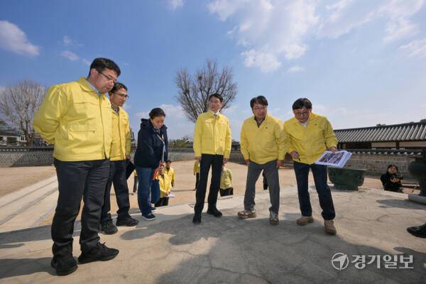 12일 오후 수원화성행궁에서 김광용 행정안전부 재난안전관리본부장, 김성중 경기도 행정1부지사, 김현수 수원특례시 제1부시장 등 관계자들이 '해빙기 대비 안전관리 대책 점검'을 하고 있다.
