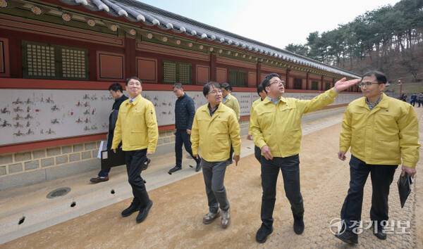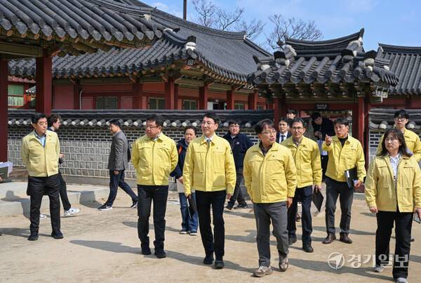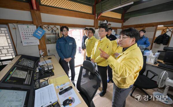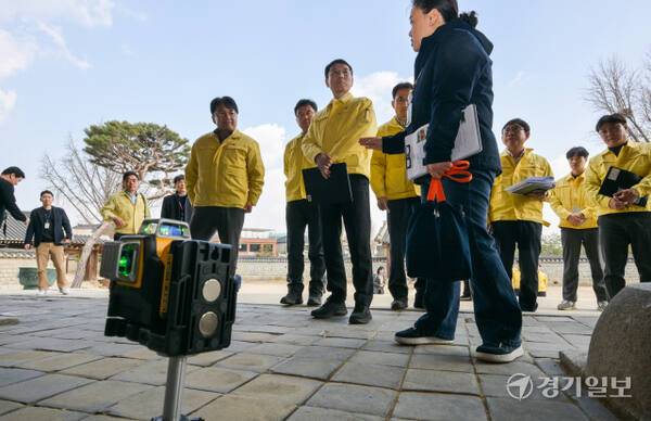 12일 오후 수원화성행궁에서 김광용 행정안전부 재난안전관리본부장, 김성중 경기도 행정1부지사, 김현수 수원특례시 제1부시장 등 관계자들이 ‘해빙기 대비 안전관리 대책 점검’을 하고 있다. 해빙기는 겨울철 얼어있던 급경사지, 옹벽, 국가유산 등 구조물에 대해 지반 침하, 낙석, 시설물 붕괴 등 사고 위험이 증가하는 시기로, 해빙기 취약시설에 대한 안전관리가 요구된다.
