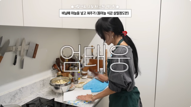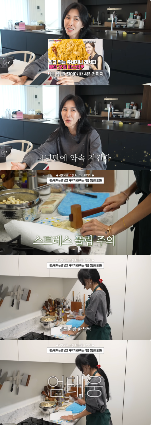 이어 마늘을 빻기 위해 큼지막한 나무 망치를 꺼내 든 윤혜진은 “남편 이름 한 번씩. 엄태웅! 이러면서”라고 외치며 거침없이 마늘을 내리쳐 현장을 웃음바다로 만들었다.