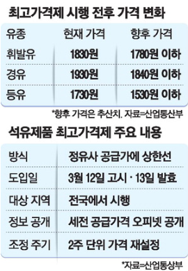 산업통상부 관계자는 이날 간담회를 열고 "12일 기준 정유사들의 휘발유 주유소 공급가는 ℓ당 1830원, 경유는 1930원, 등유는 1730원"이라며 "이보다 낮은 가격에 최고 가격을 지정할 것"이라고 말했다.