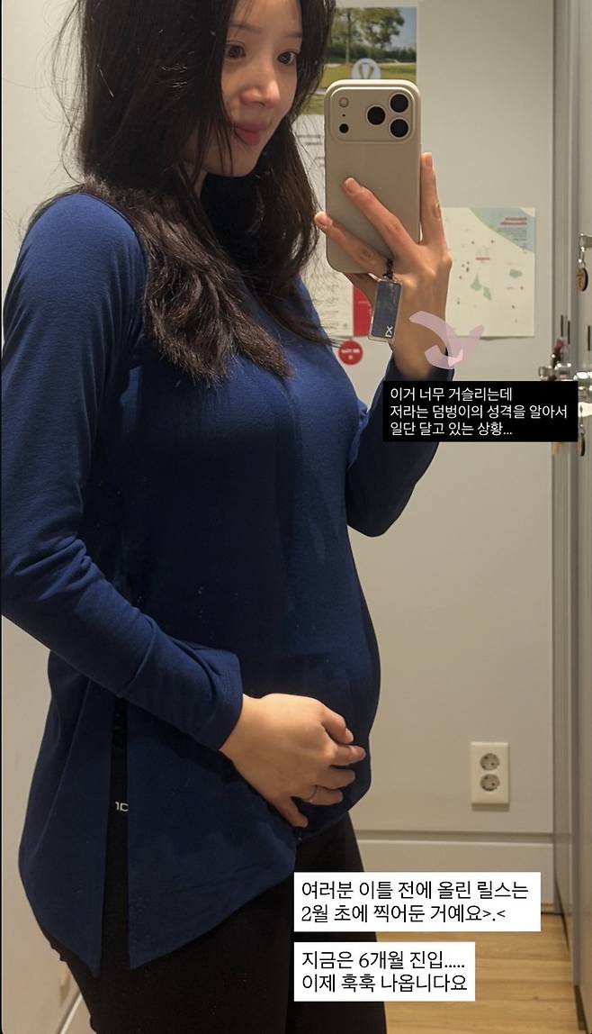 지난 11일 김지영은 자신의 계정에 "이틀 전에 올린 영상은 2월 초에 찍어둔 영상이다. 지금은 6개월 진입... 이제 훅훅 나온다"라는 글과 함께 본인의 사진을 게재했다.