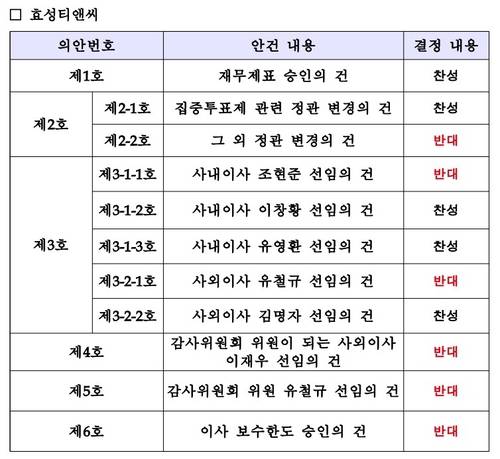 이와 함께 오는 18일 주주총회에서 2-2호 정관 변경, 사내이사 조현준 선임, 사외이사 및 감사위원 유철규 선임, 사외이사 및 감사위원 이재우 선임, 이사보수한도 승인 관련 안건에 반대키로 했다.