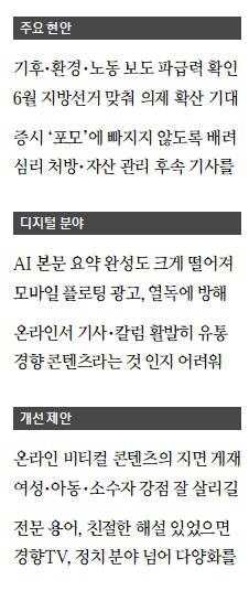 이날 출범 후 첫 회의에서 경향신문 기사와 칼럼이 SNS 등 온라인에서 많이 유통되지만, 경향신문 콘텐츠라고 인지하기 어렵다는 지적이 제기됐다.인공지능(AI) 본문요약 기사는 원기사에 비해 완성도가 크게 떨어지고, 모바일의 플로팅 광고는 독자들의 기사 접근을 방해한다는 우려도 나왔다. 주가 급등기에 시민들이 포모(FOMO·대세에서 소외되거나 남들보다 뒤처지는 것에 대해 불안감을 느끼는 심리)에 과도하게 빠지지 않도록 심리적 처방전과 실용적인 자산관리 기사가 필요하다는 제언도 제기됐다.