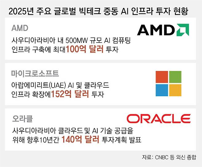 개별 기업의 베팅 규모도 상당했다. 지난해 마이크로소프트(MS)는 UAE에 152억 달러를 투입했고, 구글 클라우드와 AWS는 사우디에 각각 100억·50억 달러 이상을 쏟아부었다.