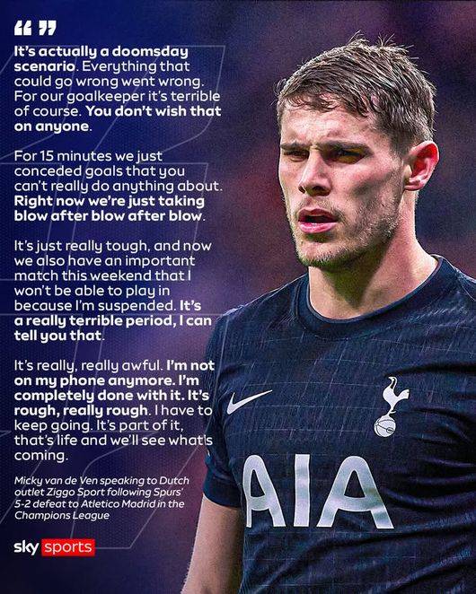 영국 'BBC'는 12일(이하 한국시간) "반 더 벤은 토트넘의 연패 상황에 한숨을 쉬었다. 그는 팀이 '종말 같은 시나리오(Doomsday scenario)'에 빠졌다며 계속해서 타격을 받고 있다고 토로했다"라고 보도했다.
