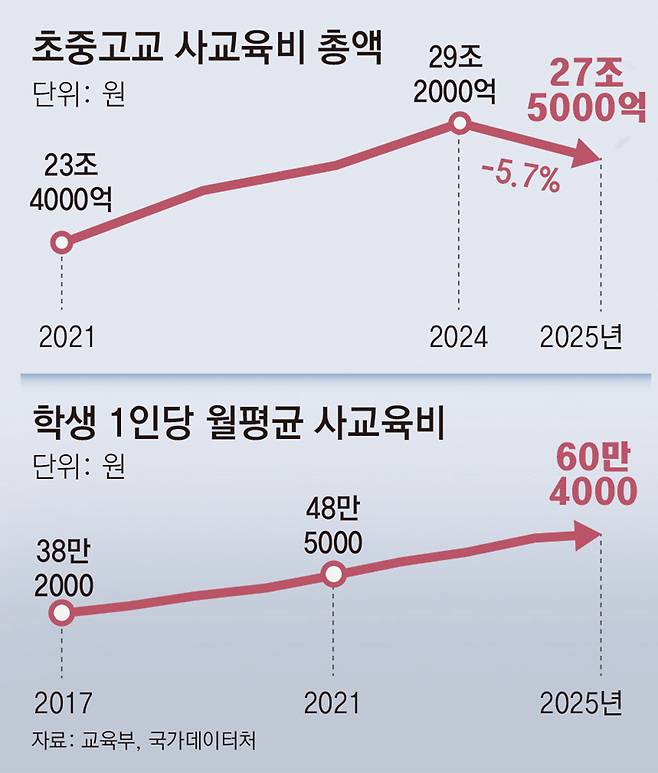 12일 교육부와 국가데이터처가 발표한 '2025년 초중고 사교육비 조사 결과'에 따르면 지난해 사교육비 총액은 27조5000억 원으로 2024년보다 5.7%(1조7000억 원) 감소했다.