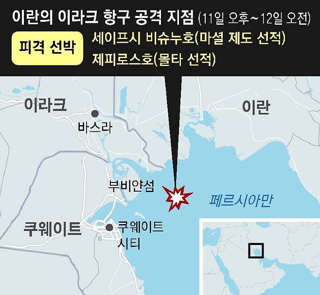 이란이 11일(현지 시간) 호르무즈 해협과 약 800km 떨어진 페르시아만 내 이라크 영해에 정박 중인 유조선 2척을 공격했다.